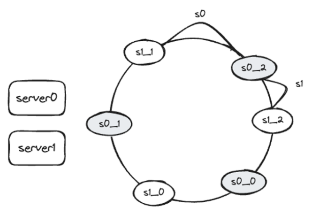 아래의 그림으로 보게 된다면 s0으로 시작하는 s0 소속의 가상 노드들과, s1으로 시작하는 s1 소속의 가상 노드들이 있다.