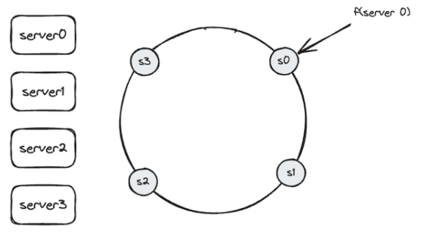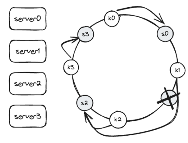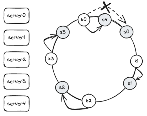 k0은 기존에 s0 서버에 저장되고 있었으나, 해시 링을 시계 방향으로 탐색한 결과 더 가까운 s4 서버를 발견했다.